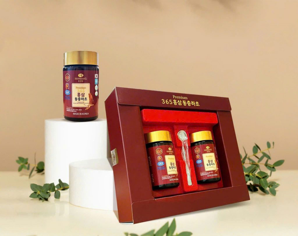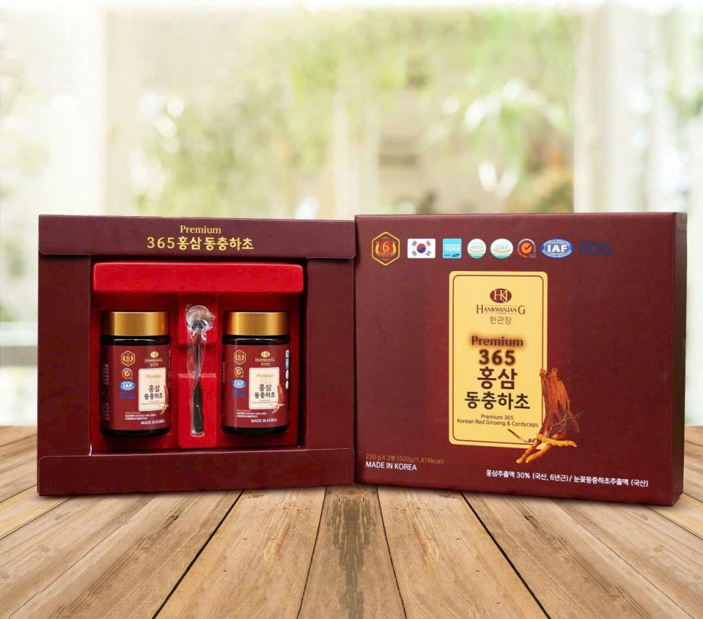 - Cao Hồng Sâm Đông Trùng Hạ Thảo 365 Hộp 2 Lọ x 240g đến từ Hàn Quốc được kết hợp giữa hồng sâm 6 năm tuổi và đông trùng hạ thảo cùng các loại thảo dược quý tốt cho cơ thể. Sử dụng sản phẩm hằng ngày giúp tăng sức đề kháng, giảm căng thẳng mệt mỏi và có gi